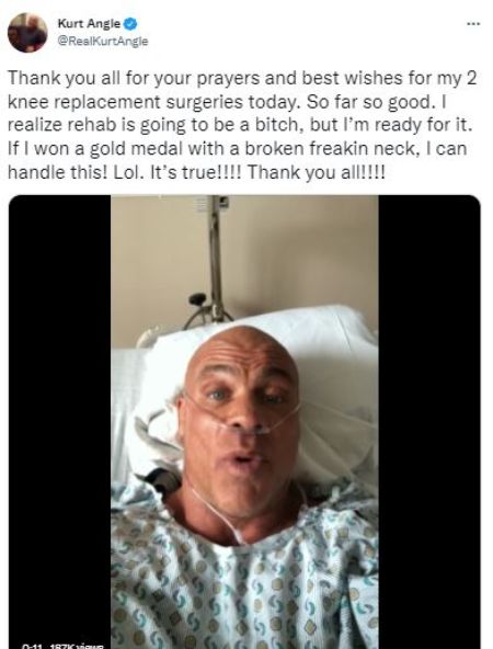 As he went under the knife, Kurt took to his Twitter on May 24 and wrote," Thank you all for your prayers and best wishes for my two knee replacement surgeries today. This is your Olympic hero Kurt Angle, and I'm in the hospital right now because I just had knee replacements done this morning.